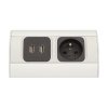 Zásuvka je vybavena 1x zásuvkou 230V+2xUSB-A. Zásuvková lišta je již osazena 0,5 m napájecím kabelem pro připojení do síťové zásuvky.
