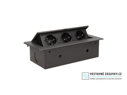 Výklopná vestavná elektrická zásuvka, oblé hrany. S připojeným 1,5m napájecím kabelem pro připojení do síťové zásuvky. Povrchová úprava: černá.